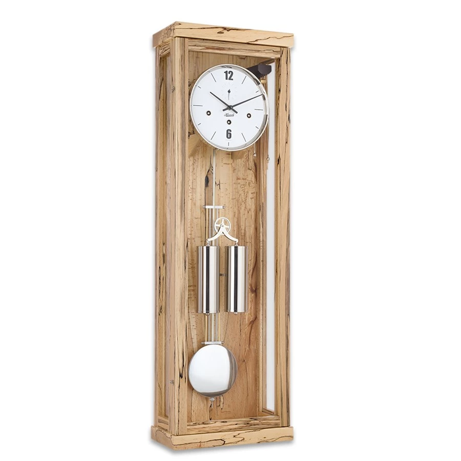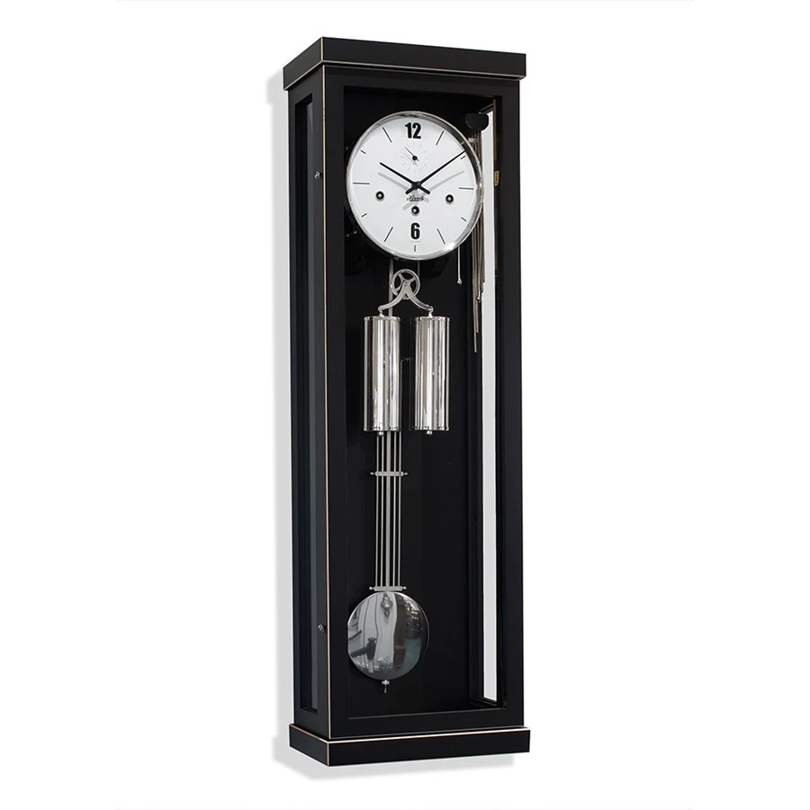 This sleek and modern wall clock boasts an 8-day cable-driven Westminster chiming movement with automatic night shut-off, silencing lever, and nickel accessories. The perfect ornament for any style of wall.