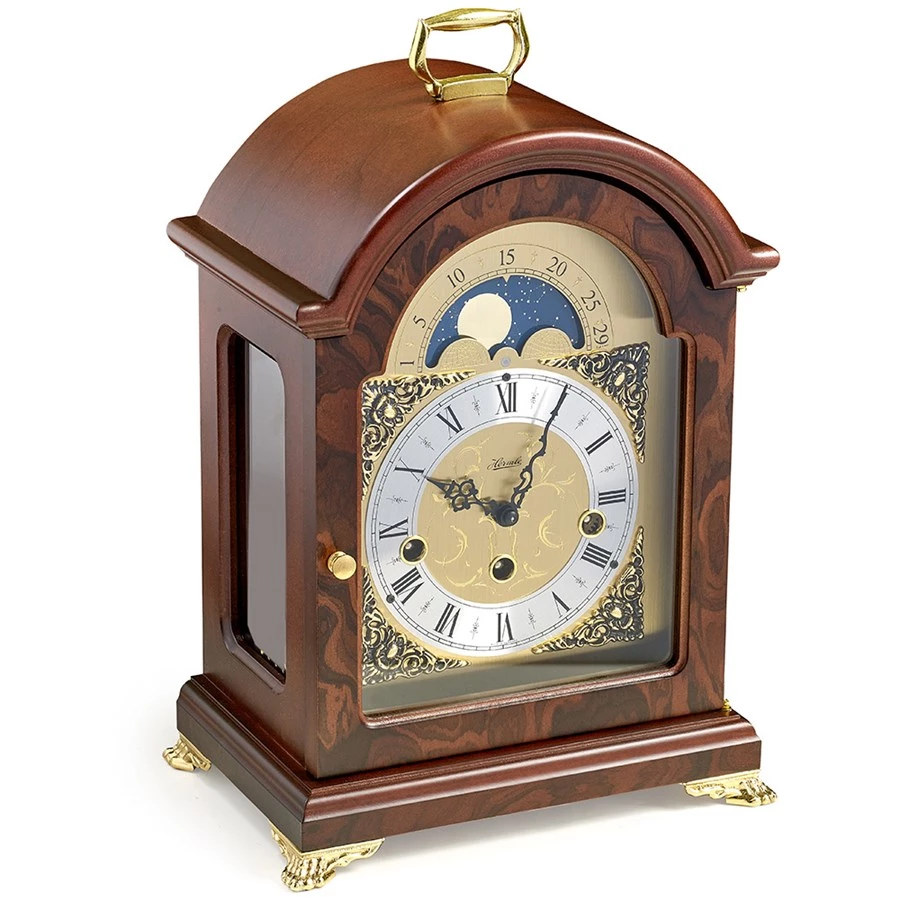 Beautiful mantel clock boasts brass feet and a mechanical 8-day Westminster chiming movement. The roman numeral clock face is topped with a charming lunar chart, tracking the progression of the moon across the night sky over a month period. Includes a brass handle for easy moving. The case opens from the front to wind, with access to the back through a matching door.