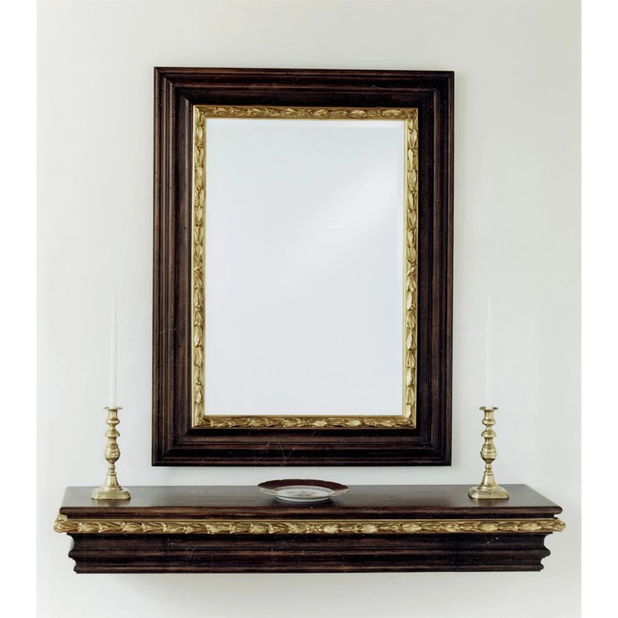 Border of antique gold leaves and berries contrasts handsomely with the distressed dark fruitwood finish on pine. Beveled mirror. Made in America.