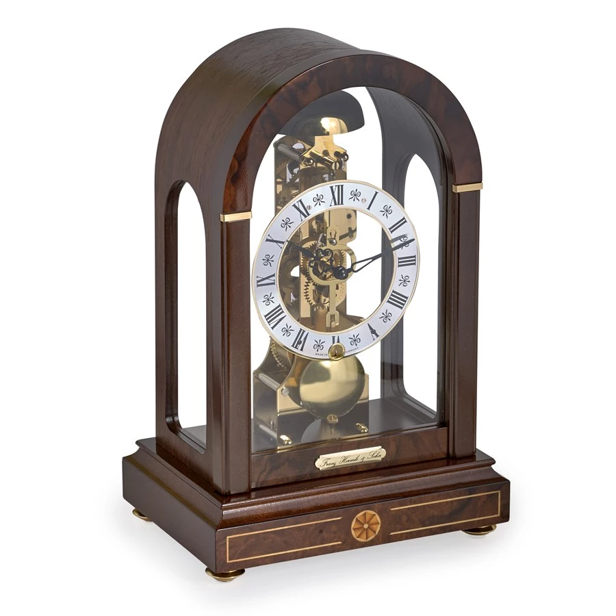Solid cherry wood case is stained in a rich walnut finish with burlwood inlays and a glossy piano finish. The mechanical skeleton movement allows for the observation and admiration of the intricacy of the engineering. The clock runs on a 14-day power reserve, and the bell strikes once per hour. Stands on four brass feet. Handmade in Germany.