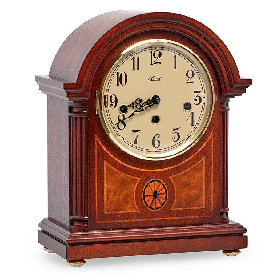 The Berlin Clock with Mahogany Finish is a masterful handmade mantel clock, made with fluted columns flanking the clock face and skillfully inlaid marquetry. The ivory clock face features black Arabic numerals and a brass 8-day key-wound movement that can chime on the quarter hour, strike Westminster chimes on the full hour, and be quietened overnight.