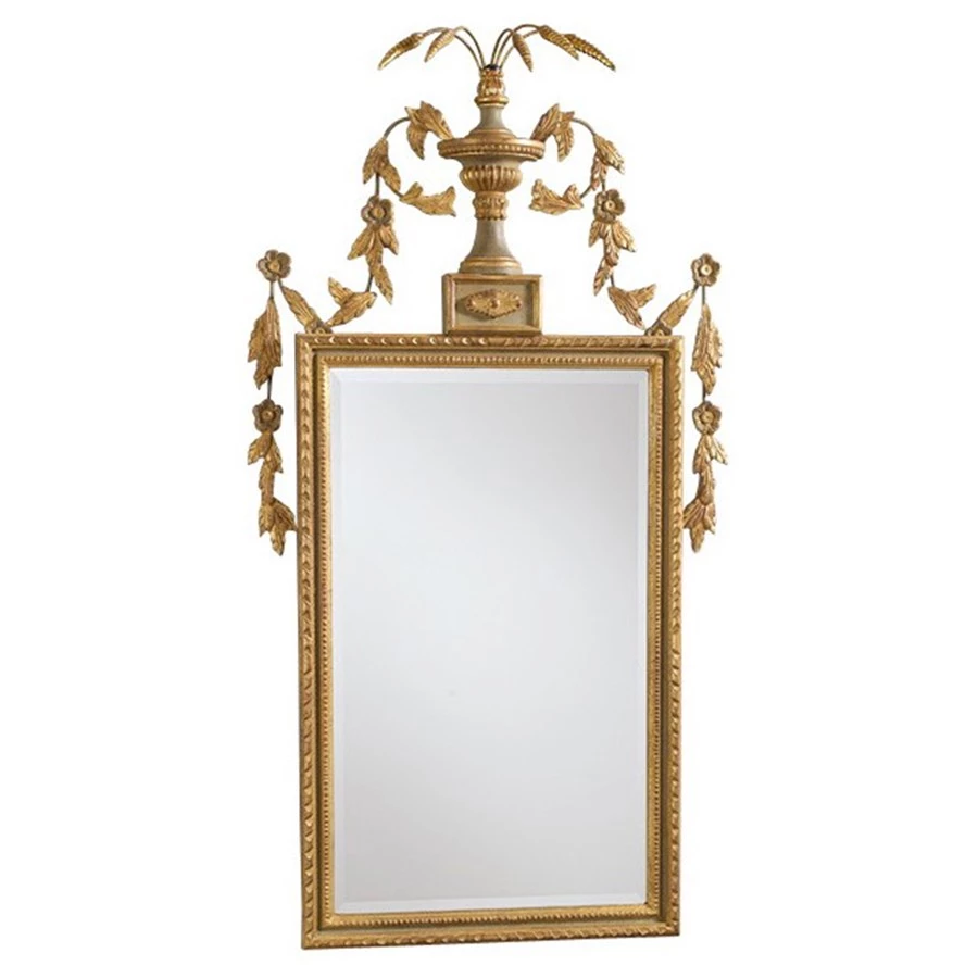 A timeless piece with delicately fluted molding topped by a classic urn with scrolling flowers and leaves. The grey and gold leaf finish and a beveled mirror add a magical touch.