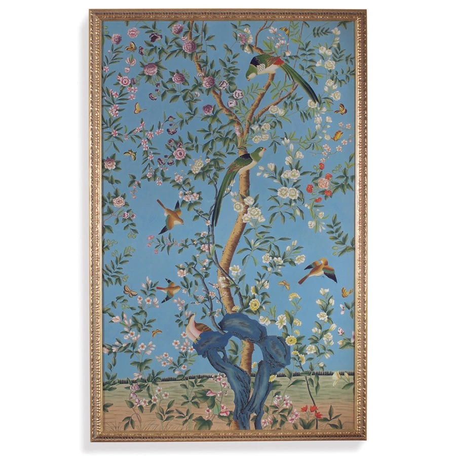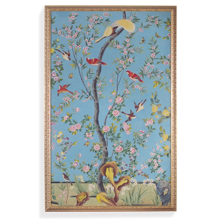 Elegant and vibrant watercolor paintings on a silk antiqued gold frames. Depicts iconic garden scenes in blue with either red birds or green birds inspired by Chinese silk panels. Look particularly striking as a pair.