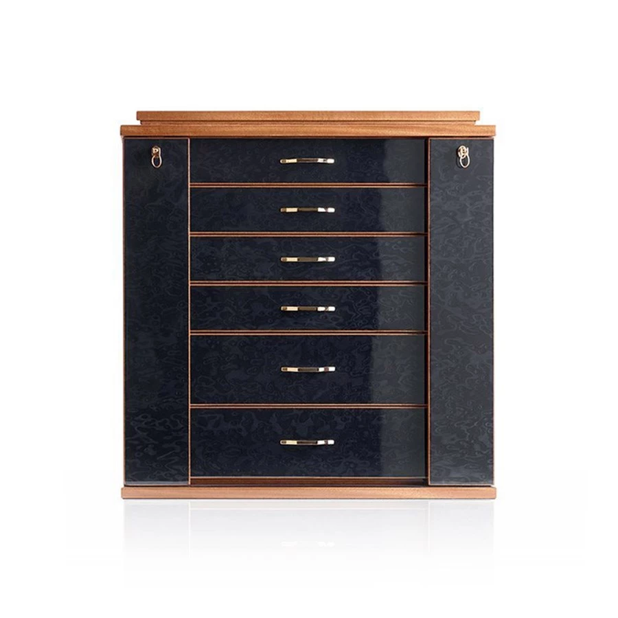 Polished birds eye maple and mahogany jewelry chest, ultra-suede lining, and 24k gold plated brass accessories. This chest includes necklace bars, lockable doors, 5 drawers, and an adjustable mirror. Handmade in Italy.