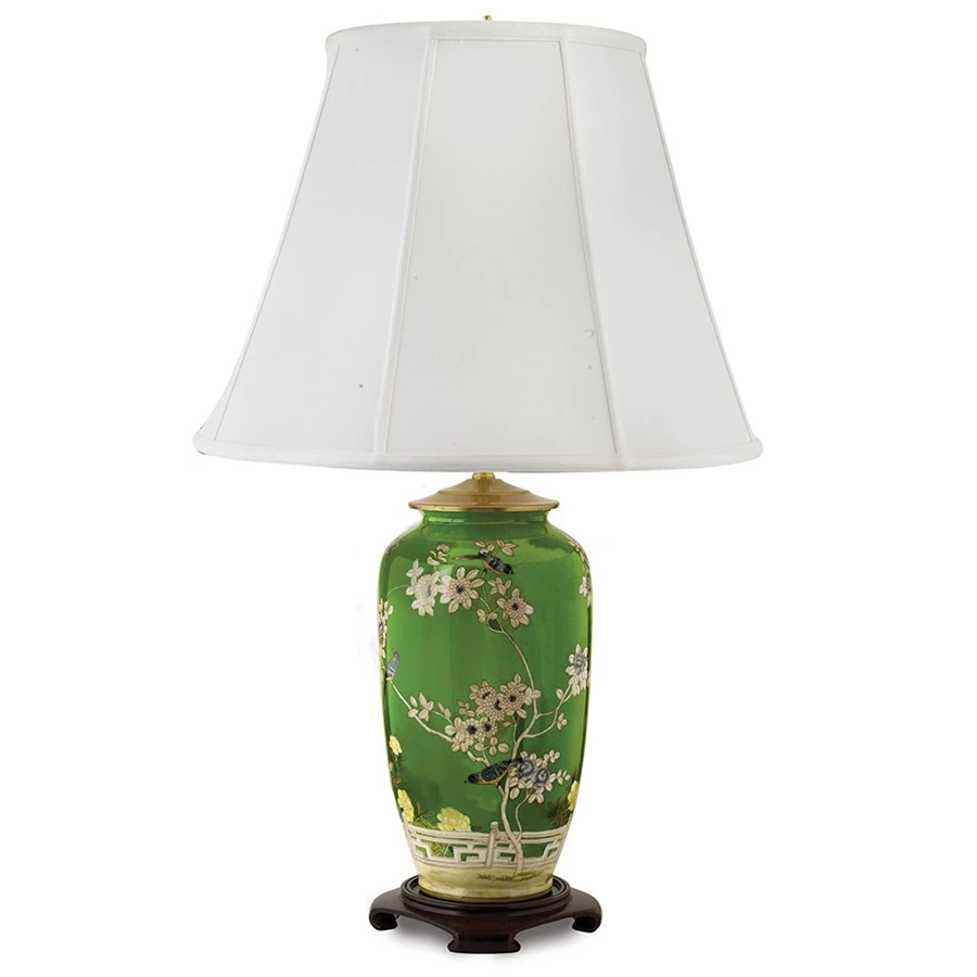 Foliage and birds delicately handpainted on porcelain. Shade is lined off-white satin. Brass finial. Uses a three-way bulb up to 150 watts. Exclusively at Scully & Scully.