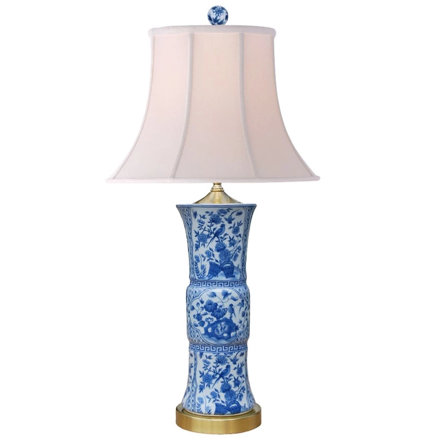 Handpainted blue and white drum style vase lamp features icnoic Chinoiserie motifs, including flora, fauna, phoenixes, and more. Handmade porcelain lamp accommodates a three-way bulb up to 150 watts. Off white shade is piped with soft lining.