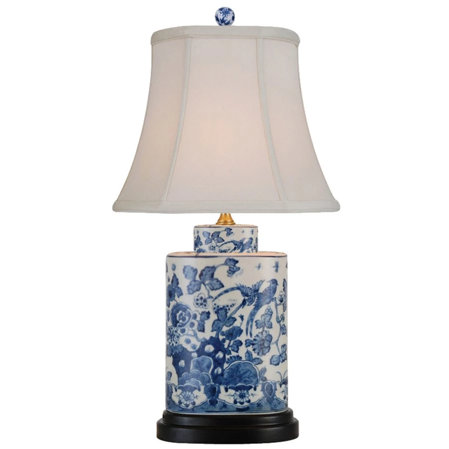 Handpainted porcelain jar with matching handpainted porcelain ball finial. Accommodates three-way bulb up to 100 watts. On-off switch on socket. Off-white piped and lined shade.