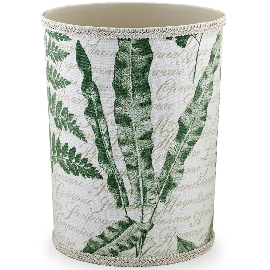 Exceptionally pretty yet highly practical wastebasket and tissue box cover are handfinished with a motif inspired by traditional botanical illustrations. The Botanical Leaves fabric is finished with braid trim over wipe-clean plastic. Made in America.