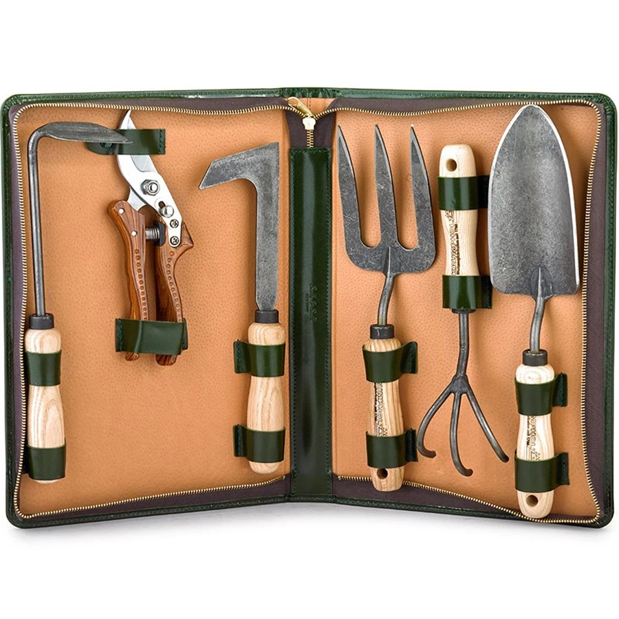 Entirely handmade in Germany of calfskin dyed a beautiful rich green. Calf Leather Gardening Kit includes six handmade ash wood and iron tools secured by hand stitched leather straps: hoe, pruning shears, billhook, fork, cultivator, and trowel. Each tool is handforged in Germany by a family-owned business since 1799. Exclusively at Scully & Scully.