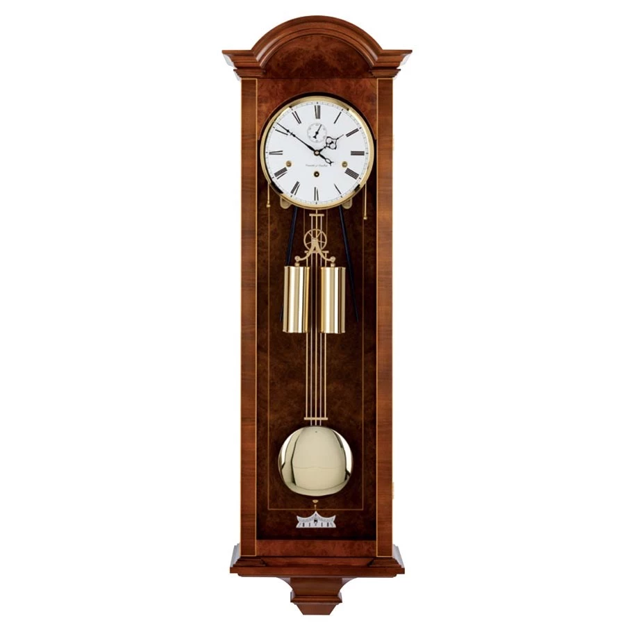 Break arch walnut case with book-matched burr walnut veneers. The door features cross-banded figured walnut with inlaid boxwood stringing. Westminster chime movement. Hand rubbed waxed finish. Handmade in England.