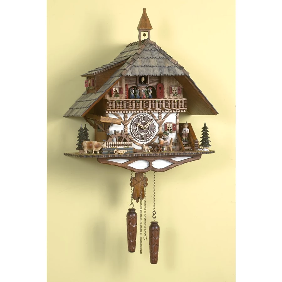Handcrafted of local woods in the fabled Black Forest by just 25 craftsmen, the cuckoo clock calls on the hour with an automatic light sensor nighttime shutoff. The musical clock uses quartz movements and the dial has roman numerals and a mechanical cuckoo at top that calls every full hour. The clock plays twelve chimes alternately, including: Clementine, Happy Wanderer, Dr. Zhivago, Edelweiss, Für Elise, He Was Beautiful, Home Sweet Home, Lorelei, Love Theme Of The Movie, Swan Lake, Sound Of Silence, and The Entertainer. The clock includes a traditional German mill scene, with smiling characters enjoying an outdoor pub. The pendulum is decorated in the form of an acorn, which further enhances the pastoral elements of the clock. Moving parts include the dancers, beer drinker, mill wheel, pendulum, and cuckoo. Handmade and handpainted in Germany.