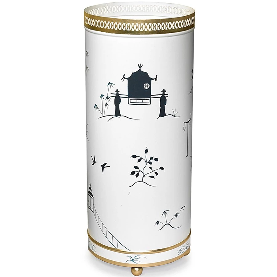 Elegant simplicity, the Chinoiserie Umbrella Stand features classic blue pieces of China over stark white background, embellished with golden edging. The four ball feet represent wisdom and purity in traditional Chinese mythology, raising umbrella handles up to a comfortable height.