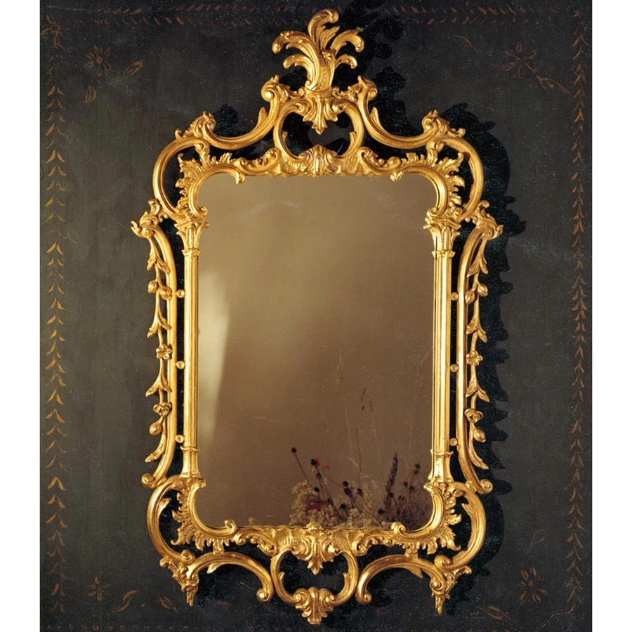 A fine exuberant Chippendale, this mirror is crested by the ever-favored acanthus leaf. Hand gilded with antique gold leaf finish fitted with a beveled mirror. Made in America.