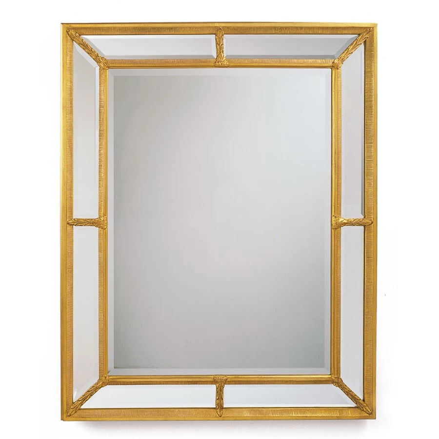 Double frame, combed and linked by acanthus frets, forms a striking linear pattern. Canted and beveled side panels, a beveled central panel, and an antique gold leaf finish make it shimmer.