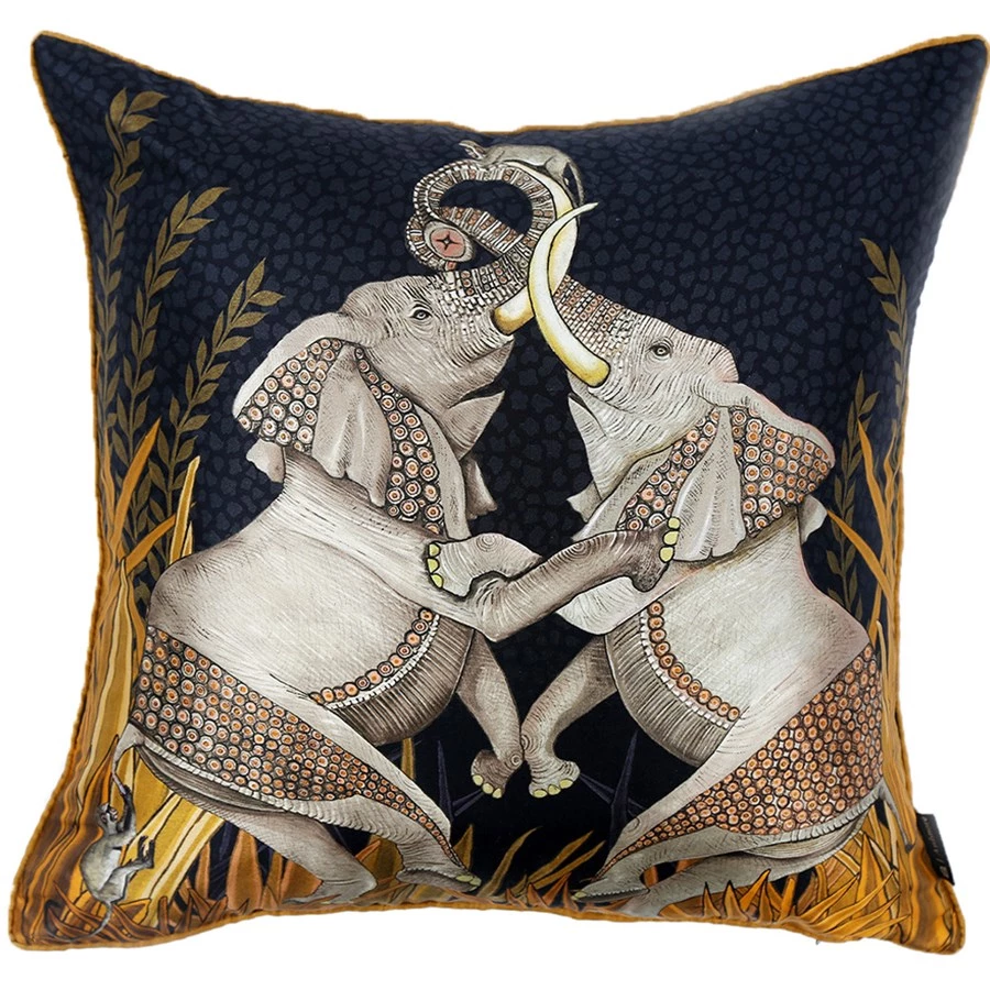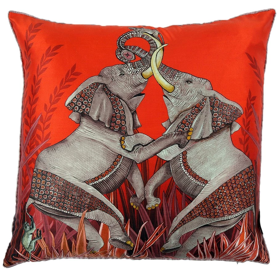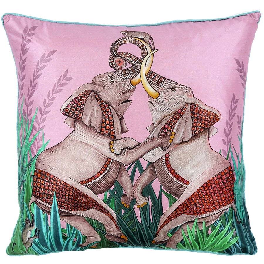 A playful pair of pachyderms rise up from the lush savannah in this whimsical design. Prints on handmade silk covers with zippered side to remove for dry cleaning. Pillow insert is 100% American-made hypoallergenic polyester fill.