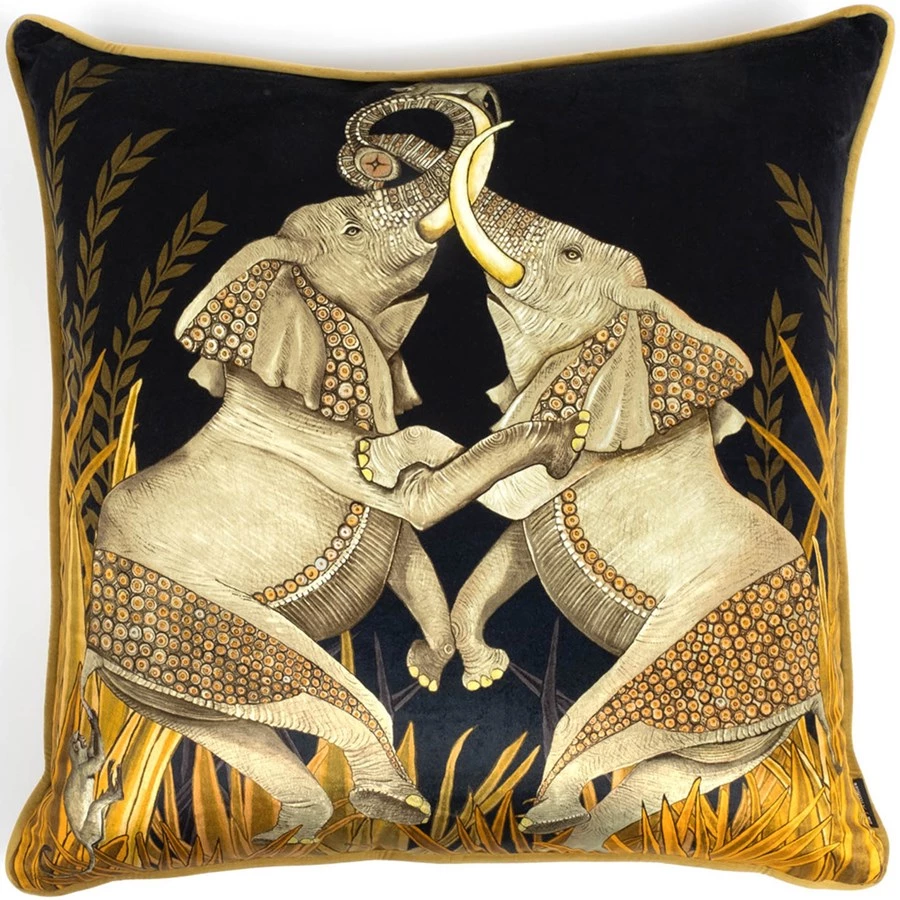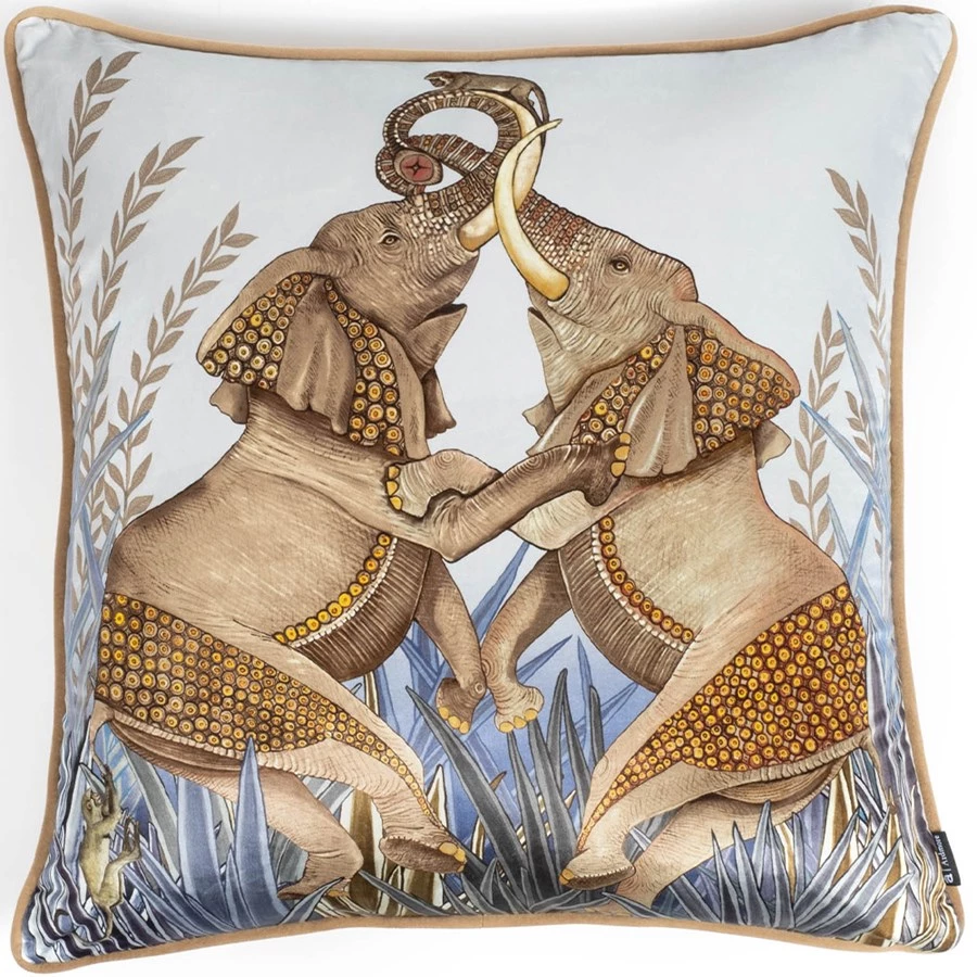 A playful pair of pachyderms rise up from the lush savannah in this whimsical design. Prints on handmade velvet covers with zippered side to remove for dry cleaning. Pillow insert is 100% American-made hypoallergenic polyester fill.