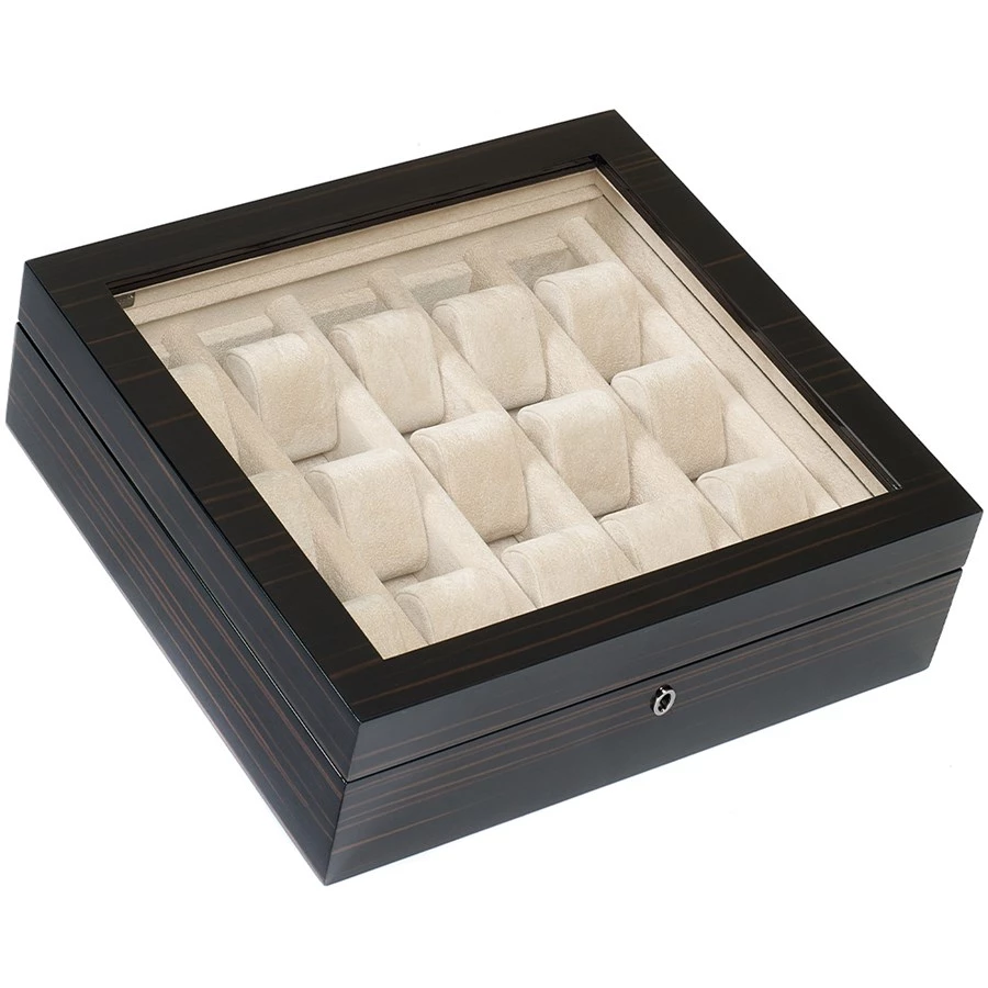 Handcrafted of fine ebony, store and display your watches in equally stunning style. The ebony wood is polished to a glossy finish that allows the richness of the wood veining to shine through, with a clear glass cover allowing you to view up to 15 watches stored inside a lockable lid. The lining is entirely anti-tarnish micro-suede to protect your timepieces. Handmade in Italy