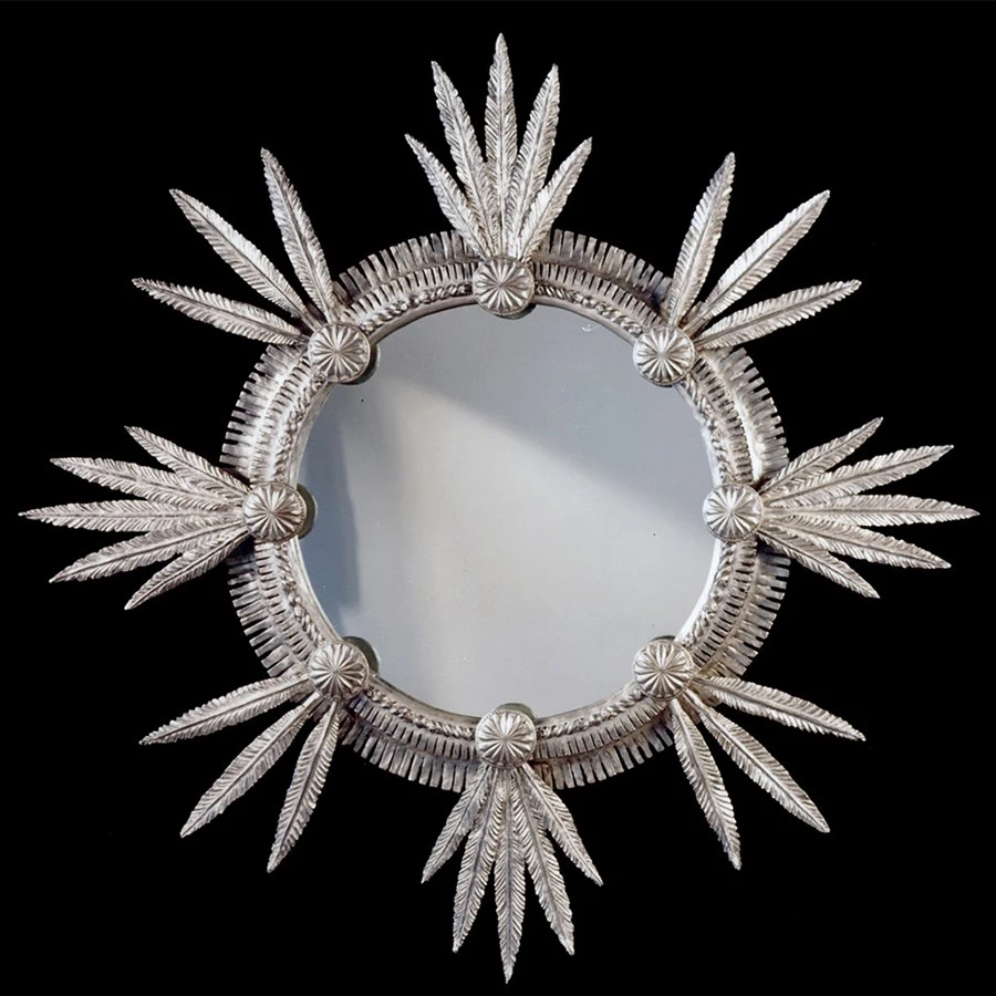 This fanciful mirror is a burst of symbols from the Indian traditions of the Great West. A ring of fringed and beaded rawhide is encompassed by a headdress of feathers clasped by conchas. The frame is leafed in sterling silver. The design is centered by a convex mirror – bright like the sun and round like a council circle or kiva, gathering in all that surrounds it. …Carol Canner Designer/Sculptor Made in America.