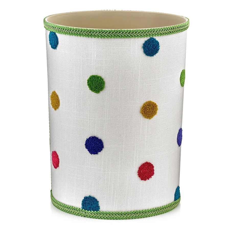 Charming polka dot wastebasket and tissue box cover with green trim. Exceptionally pretty yet highly practical, each wipe-clean plastic interior is overlaid with beautiful fabric and braid trim. Made in America.