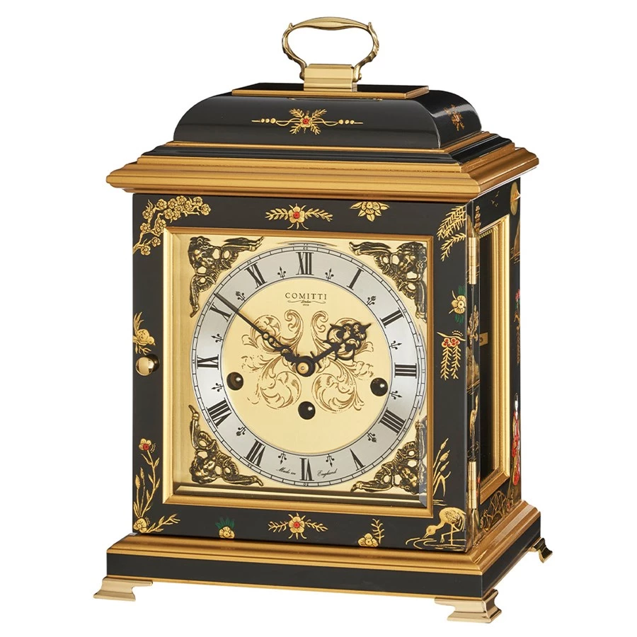 Chinoiserie — a romantic interpretation of the Orient through a European perspective, with the use of ancient motifs such as florals, pagodas, and birds. This stunning Georgian style basket top clock is lacquered and individually handpainted. Each clock requires two weeks to complete the artwork alone: layer gesso, gold leaf and final decorative detail. Finest quality triple chime eight day movement with automatic chime sequence correction and night silencer. Nine jewel platform escapement. Solid brass dial has silvered chapter ring, cast brass spandrels and fine milled hands. Beveled glasses fitted on all sides. All brassware is goldplated. Handmade in England exclusively for Scully & Scully. Each has an engraved plate with individual number and Certificate of Authenticity. Limited edition of 50.
