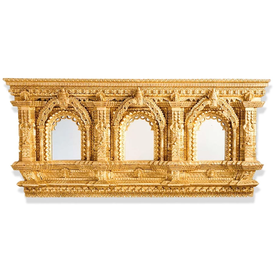 A palace window from the 17th Century Hindu Kingdom of Bhaktapor, this mirrored triptych makes an exotic focus as an overmantle in a garden niche. The intricate pattern and sculpted motif reflects the same exquisite style and aesthetic tradition as the oriental rug. Finished in antique gold leaf. Made in America.