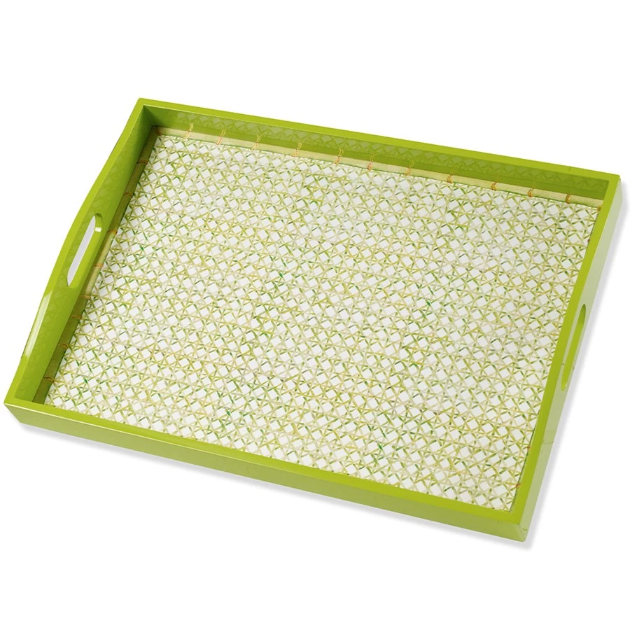 Handmade lacquered wood tray with a detailed trellis design composed of green intersecting lines bordered by painted bamboo stems.
