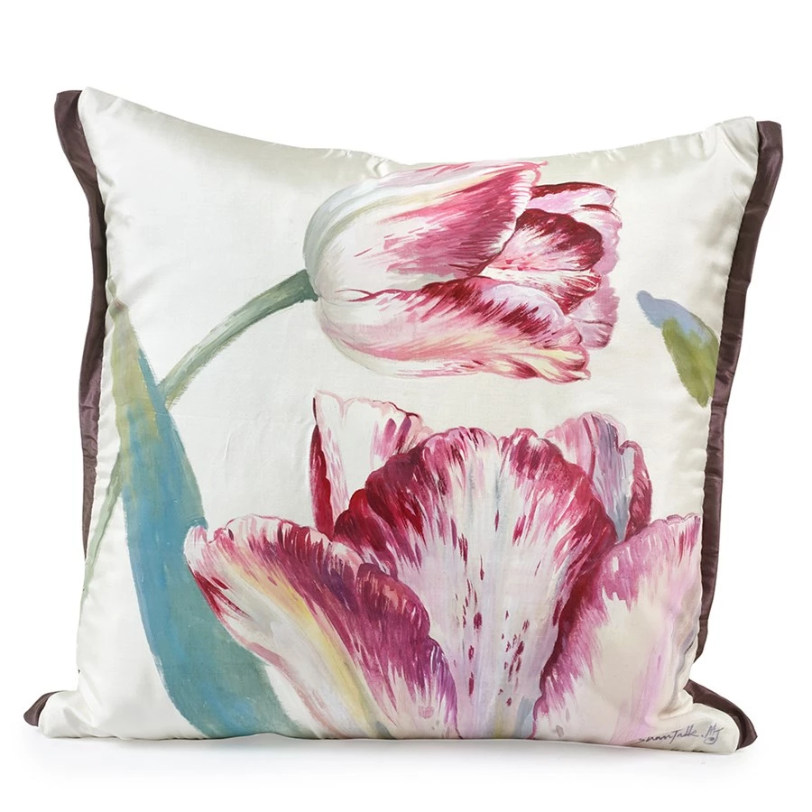 Handpainted pillows of pure hand-woven silk. Zippered covers remove for dry cleaning or hand washing. Inserts are 95% feather and 5% down. Purple silk trims and backs. Handmade in America.