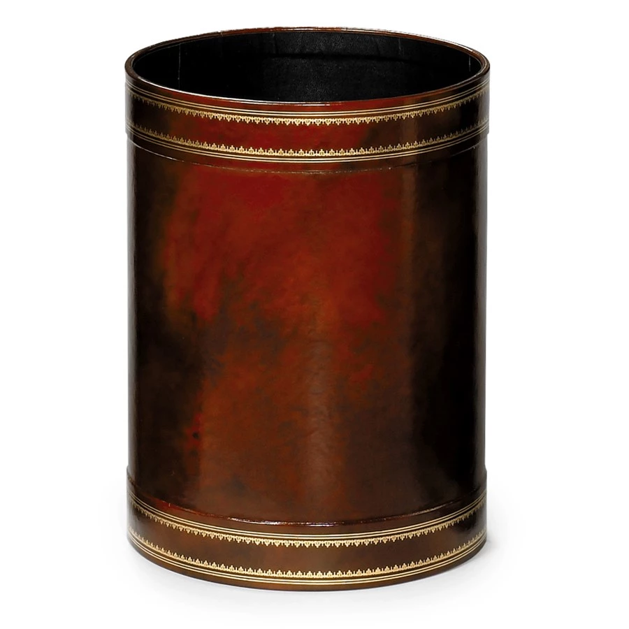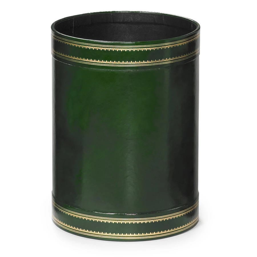 Wastebaskets you won’t want to hide under the desk, in six colors. Handmade in America in top grain leather handtooled in gold. Exclusively at Scully & Scully and available in red, burgundy, green, navy, brown, or black.