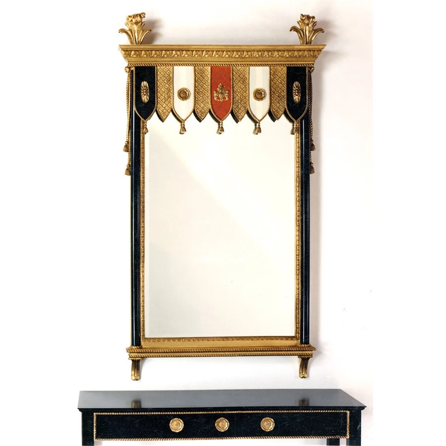 Multi-colored canopy of tasseled heraldic shields hangs boldly between javelin-like columns topped by festive plumes. Rope and tassel ties, as well as a deeply sculpted pediment, strengthen the Heraldic Pavilion’s stately presence. Finish is antique gold leaf with black, off-white, and carnelian on the canopy with black lacquer on the columns. Beveled mirror consummates this show-stopping design. Made in America.