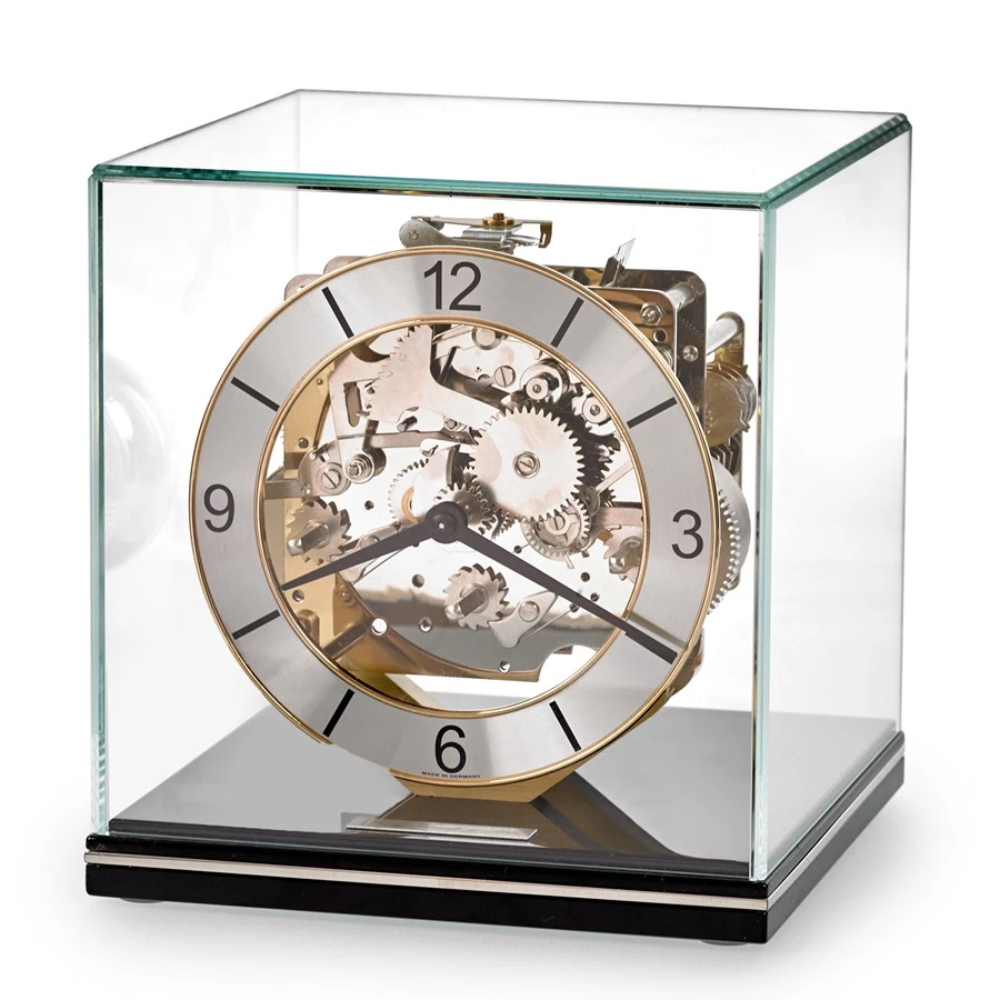 The minimalistic cubic form of this clock qualifies it perfectly for a detached positioning in an open room. The particular of the wooden, piano-finish base is the polished metal inlay. The dial is made of polished brass with a modern Arabic number print. Eight day movement with Westminster chime. Handmade in Germany.