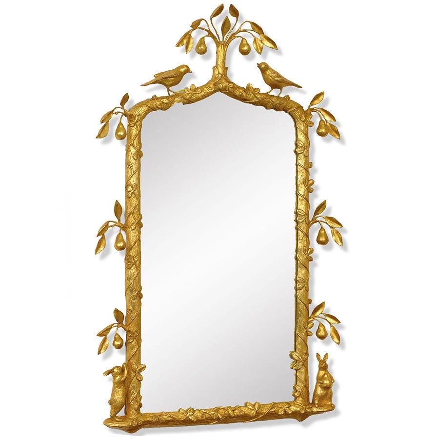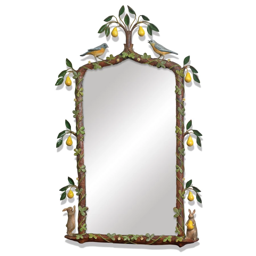 Lively cottontails and bluebirds adorn Carol Canner’s creation. The tree, espaliered into a gothic frame, has branches of Bartlett Pears and flowering vines. Frame is hand-molded wood composite hand-finished and handpainted. Made in America. Available in both antiqued gold and full color. The full color mirror is made exclusively for Scully & Scully.