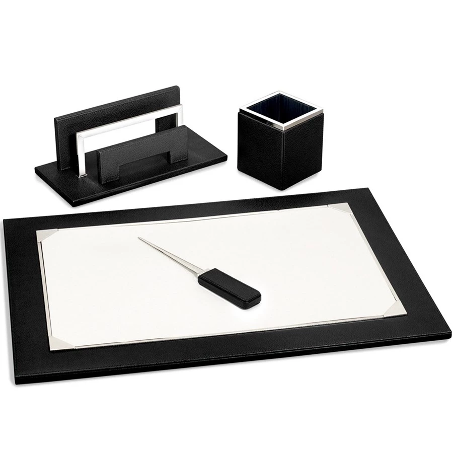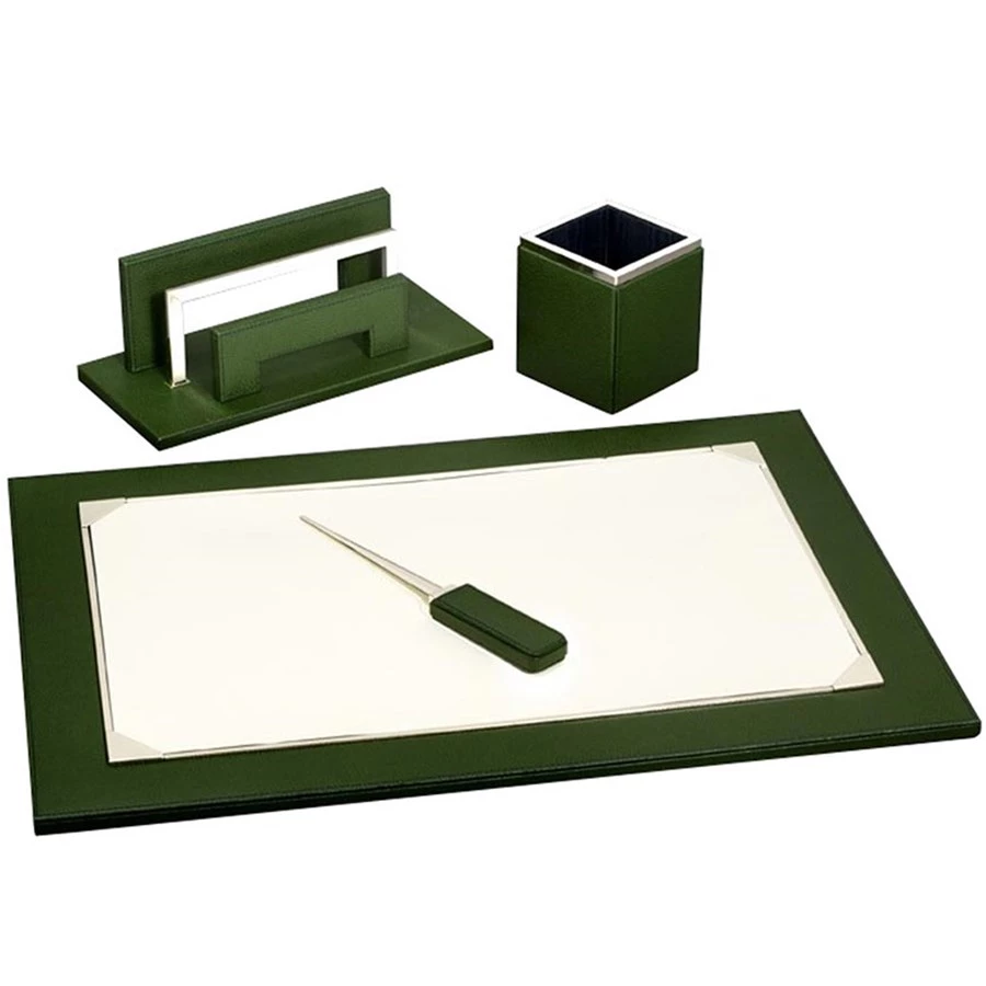 Desk pad measures 23¾” x 16½”. Letter rack measures 12″ x 5¾” x 4″ h. Pencil cup measures 4″ square x 5″ h. Letter opener measures 10¼” x 1½”.