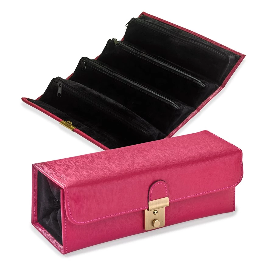 As practical as it is pretty, this case from Italy has four triangular zippered compartments that form a square when the case is rolled closed. Fine leather with crosshatch Saffiano texture and black suede lining. Locks with key. Exclusively at Scully & Scully.