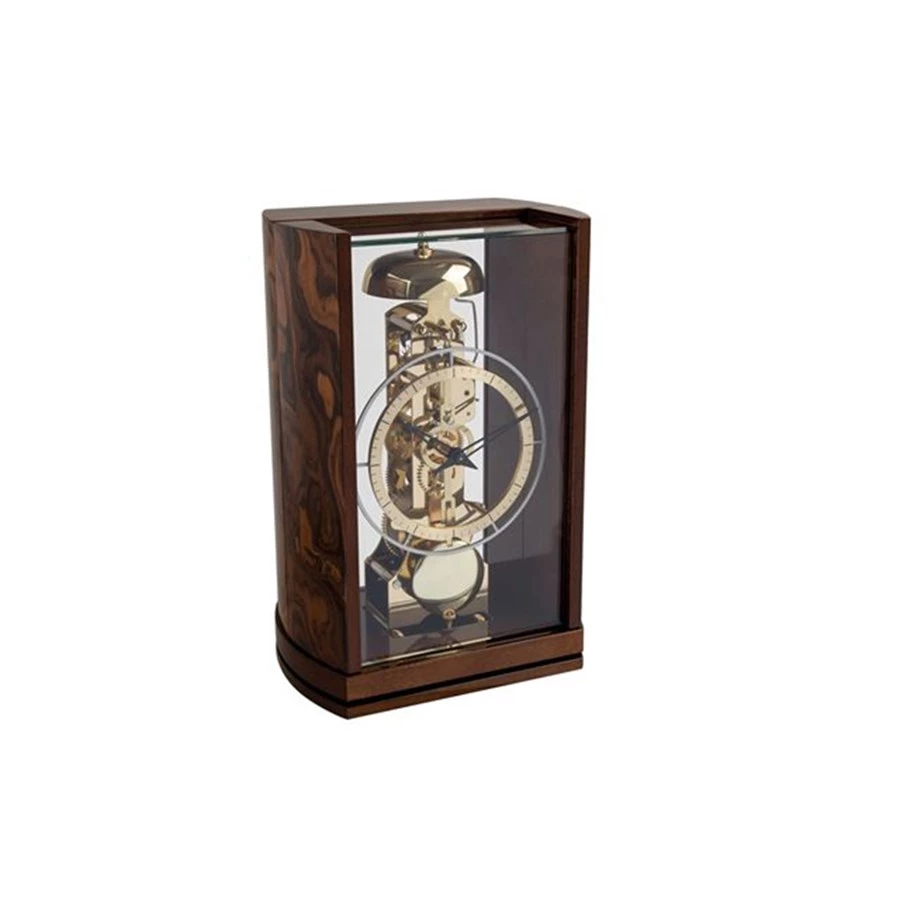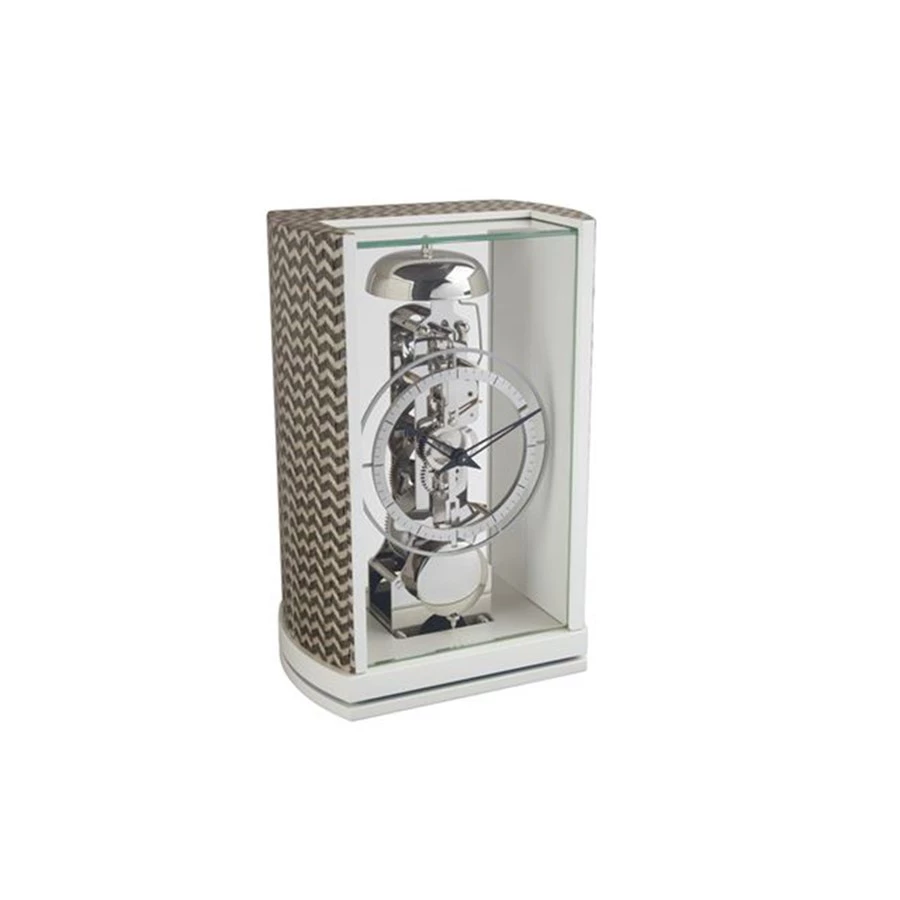 Table clocks with fashionable accents and 14-day skeleton movement detailed in brass. The dial is crafted out of stainless steel with bicolor elements, front pendulum and passing bell strike on the hour.