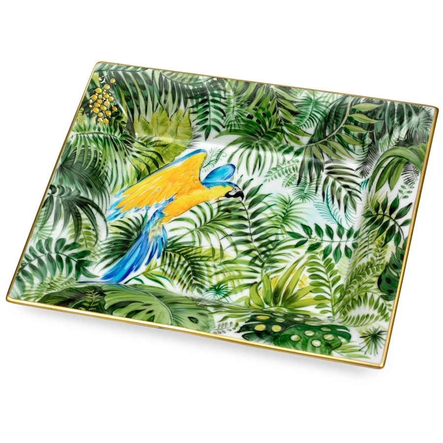 Handmade and handpainted in France decorated with 24k gold accents complimenting a lush jungle motif on Limoges porcelain. Exclusively at Scully & Scully.