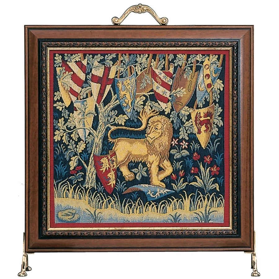 Decorate your fireplace when not in use with a tapestry design from the tales of King Arthur. Handwoven cotton blend jacquard tapestry woven in Belgium and finished in England. Solid brass handles and feet. Exclusively at Scully & Scully.