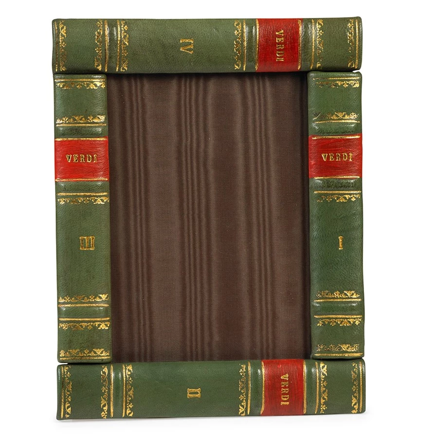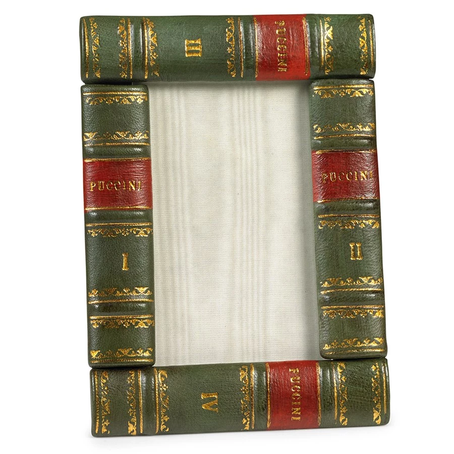 These delightful frames consist of green and red leather over wood. Each side of the frame is the spine of a book, detailed with antique gold. Bring the look of old books to your home or office with these tasteful frames featuring fine antique Florentine hand-tooled leather over wood.Two-way easels for vertical or horizontal display. Handmade in Italy exclusively for Scully & Scully. Please note that books may vary from shown.