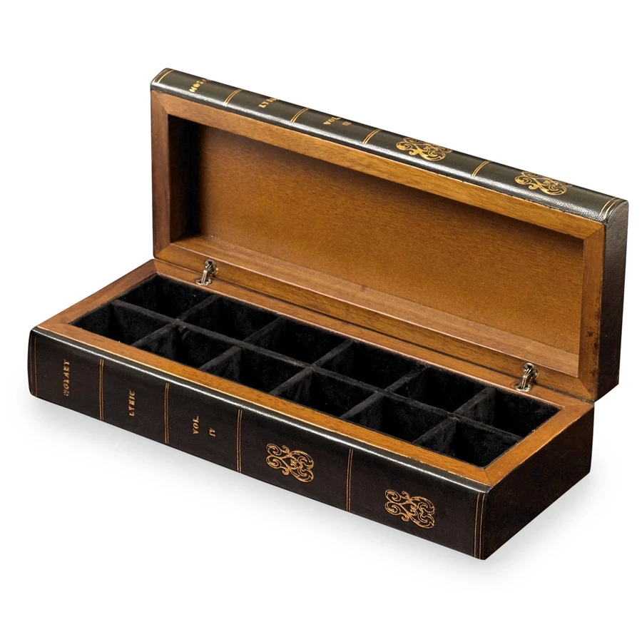 Bring the look of old books to your home or office with this tasteful accessory featuring fine antique Florentine hand-tooled leather over brass with reproduction book spines. 12 compartments. Easily cleaned with shoe cream. Handmade in Italy. Exclusively at Scully & Scully. Please note that books may vary from shown.