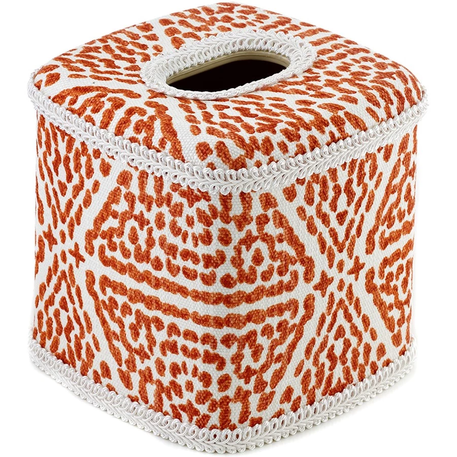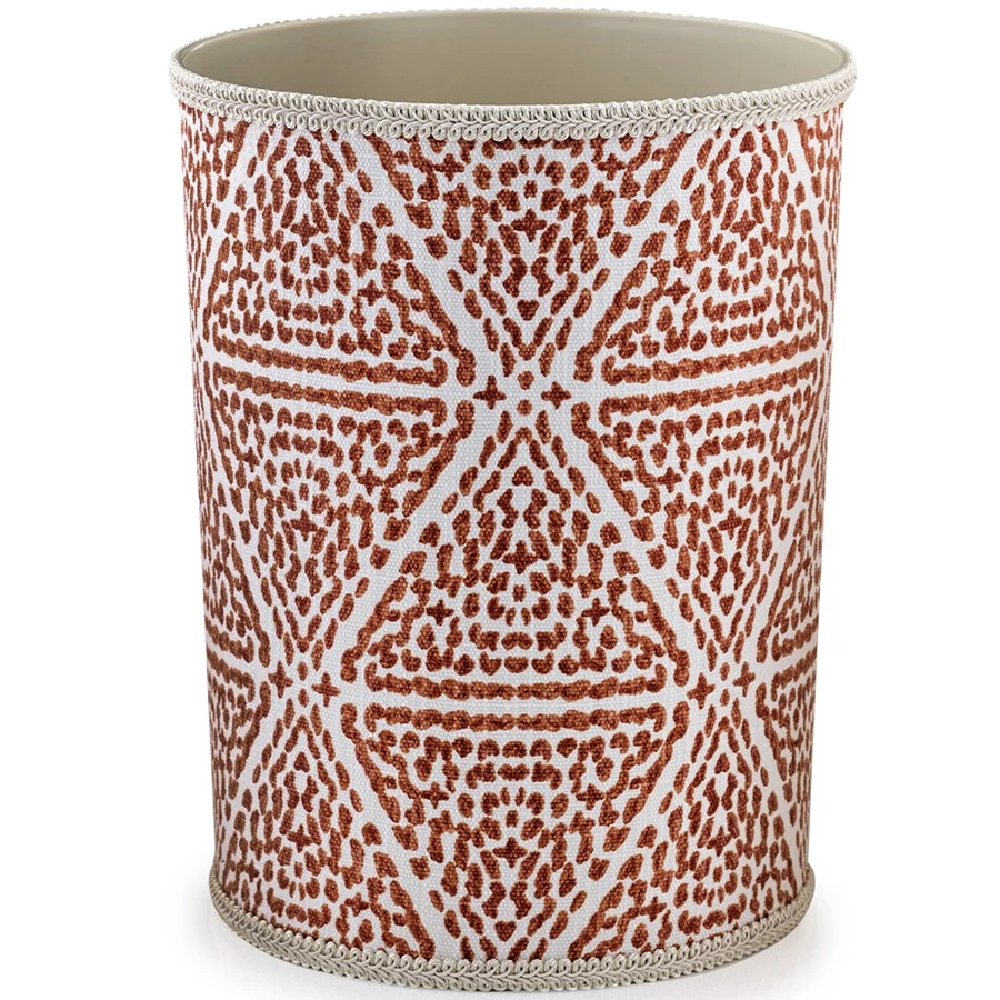 Exceptionally pretty yet highly practical wastebasket and tissue box cover are handfinished with a fabric inspired by the frenetic energy and grid layout of Madrid. The Madrid Coral fabric is finished with braid trim over wipe-clean plastic. Made in America.
