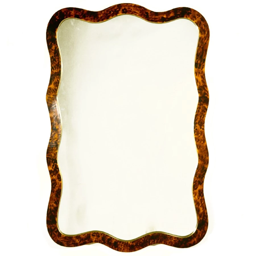 Designed by Carol Canner, the Melody mirror is a transitional piece with a beautiful tortoise shell pattern accented by handpainted gold inner edging. Finished in handlaid gold leaf, the Melody mirror is a lyrical piece with a serpentine frame. Made in America.