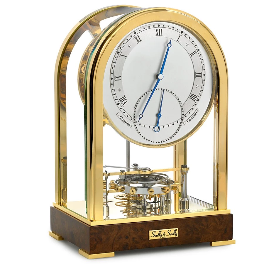 The Meridian is a beautifully executed timepiece inspired by the work of Dr George Daniels CBE (1926-2011), considered by many to be the finest horologist the world has seen. The movement features a special version of his co-axial escapement, a world first and unique contribution to the story of precision mechanical clockmaking. The large balance wheel is controlled by a nickel alloy spiral balance spring that beats 60 times per minute. The symmetrical co-axial escapement is fitted with 4 ruby pallet stones, its unique action reduces friction and eliminates the need for oil. The clock also features a unique automatic Remontoire winding system that eliminates the need for a key. The winding system is powered by an energy cell in the base with a power reserve greater than 12 months. The movement is handmade from solid brass and with a gold-plated polished finish. The time and passing seconds are indicated on a dial with silver-plated chapters and blue finished hands in the Breguet style. The humpback case is fitted with bevelled edge glasses so that the exquisite detail of the mechanism is fully displayed. Each clock is numbered, supplied with a mahogany finish presentation travel case and Certificate of Authenticity. Handmade in England. Exclusively at Scully & Scully. Limited edition of 500.