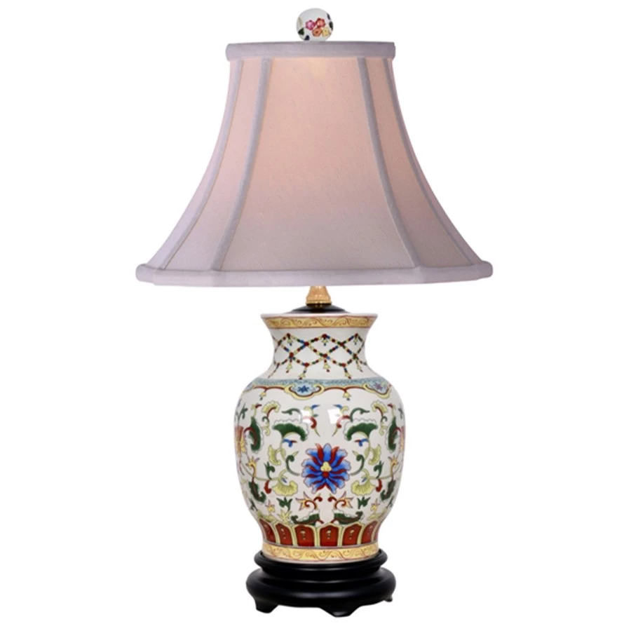 Handpainted porcelain jar with matching handpainted porcelain ball finial. Accommodates one standard bulb up to 60 watts. On-off switch located on cord. Off-white piped and lined shade.