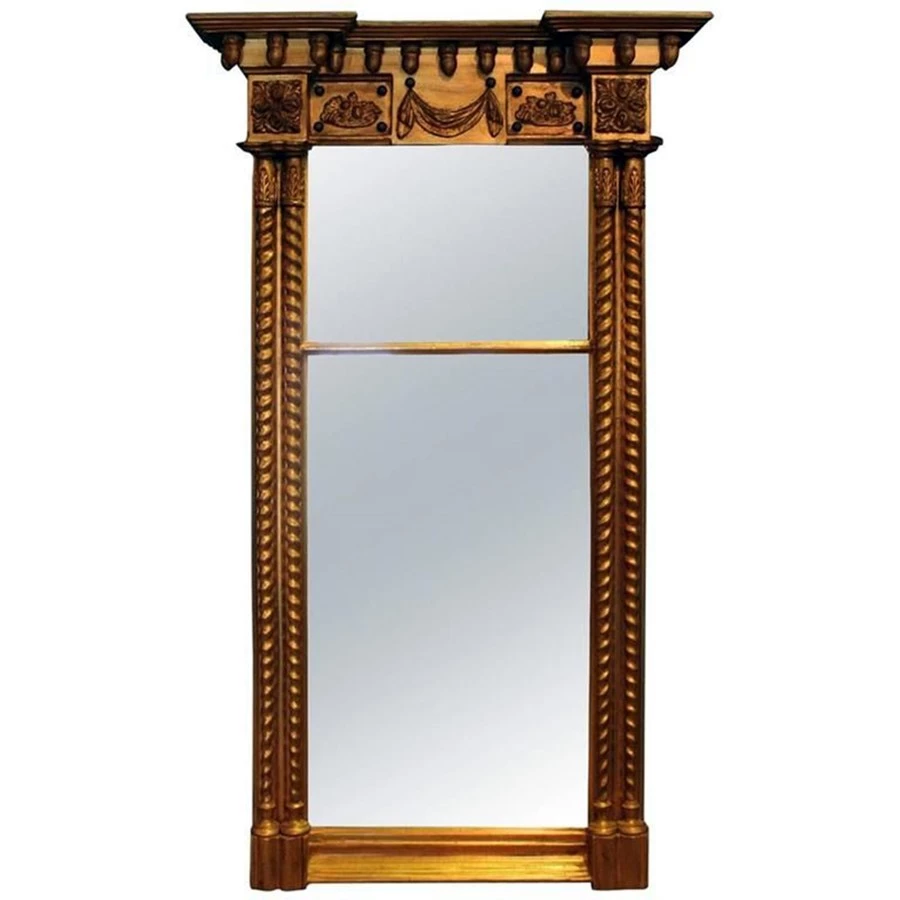 Turned surfaces catch the light on this magnificent neoclassical mirror design, circa 1820. Handcrafted with a deep overhanging pediment studded with acorns, a prominent aspect of Greek mythology and given by Zeus to his followers. Twin twisted columns flank each side of two beveled mirrors. The hand-carved wooden mirror is finished with hand-applied antique gold. Handmade in America.