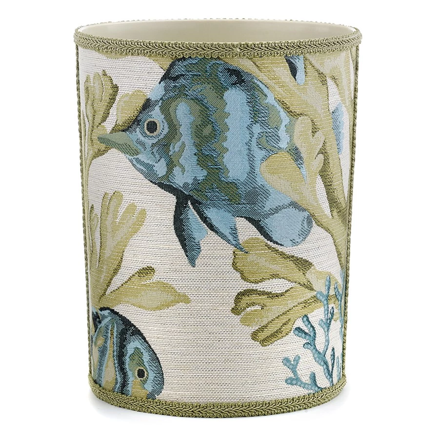Exceptionally pretty yet highly practical wastebasket and tissue box cover are handfinished with a serene teal Ocean Fish motif fabric and braid trim over wipe-clean plastic. Made in America.