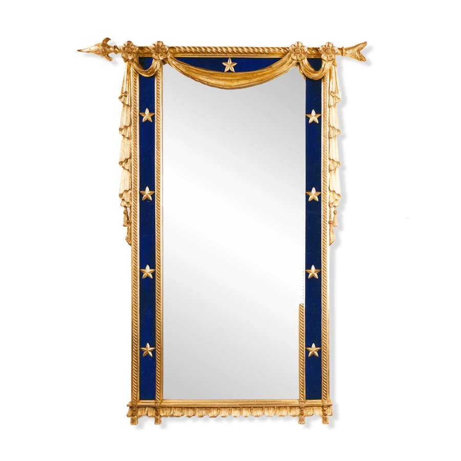 Regal stars beam from cobalt blue glass side panels. The upper swag, tasseled side drapery, and tasseled bottom flounce evoke all the drama of the golden stage. The supporting rod which doubles as a fish spear completes the magic of this fantastic mirror. The ornamention is finished in handlaid gold leaf. Made in America.