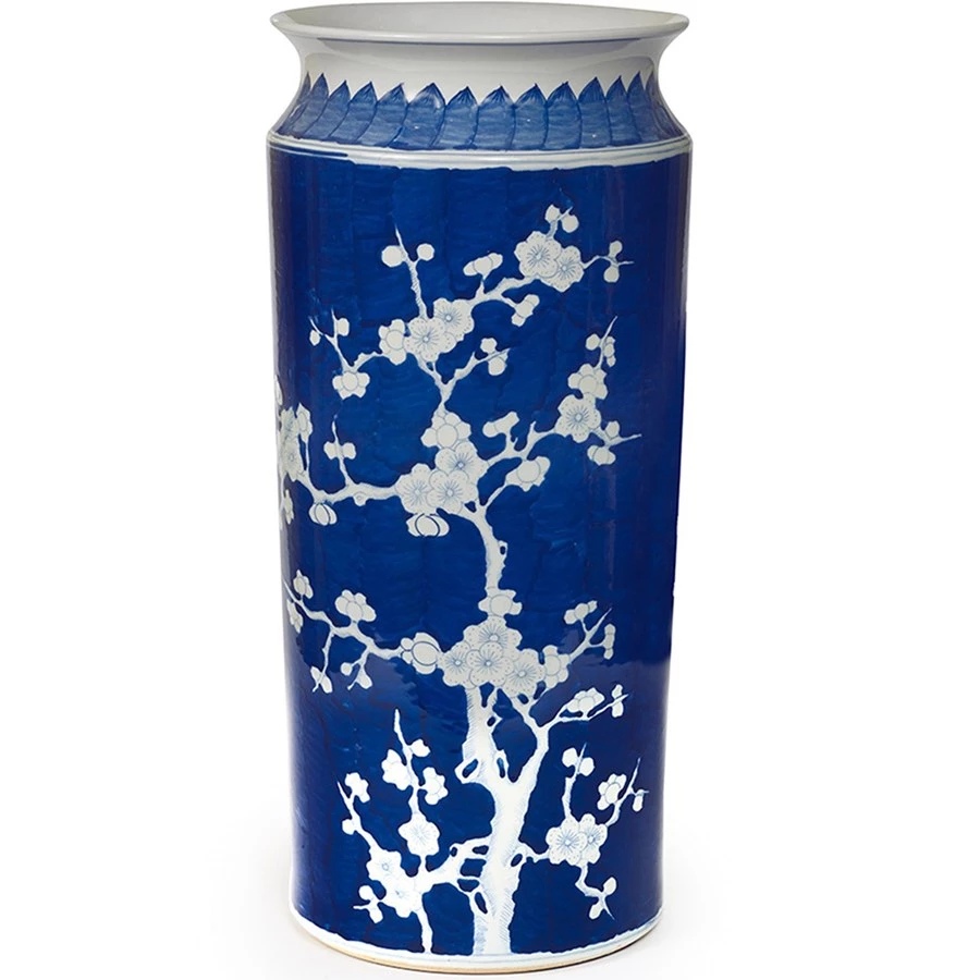 Beautifully handpainted in a lush floral plum blossom design, this handmade Chinese porcelain umbrella stand is useful and a fine decorative accessory in your entryway. The classic blue and white color palette is used to create an elegant silhoutte style of motif.