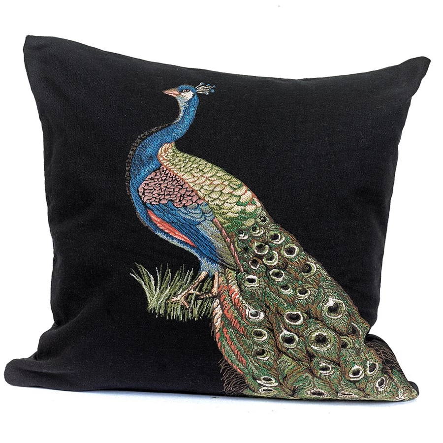 Accent your home with these elegant fine woven tapestry pillows featuring detailed pheasant portraits on a striking black background. Finished with luxurious British velvet back, these are handmade in England. American-made inserts are non-allergenic with polyester fiber in cotton covers.
