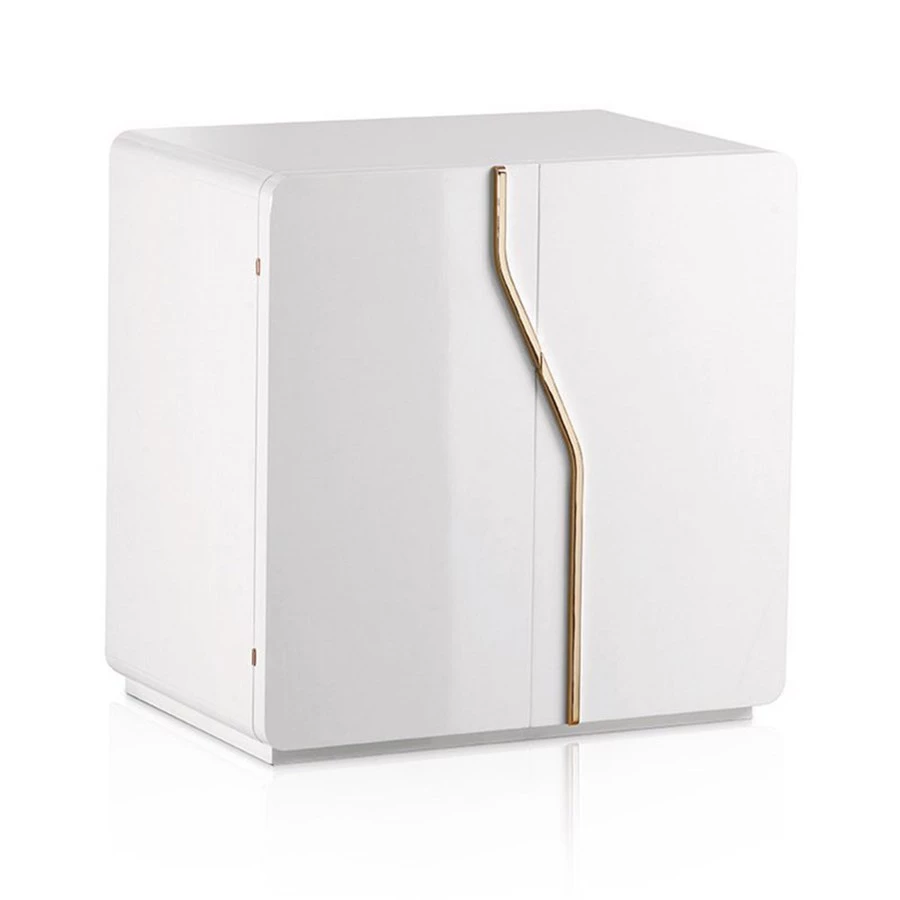 Polished white bird’s eye maple or walnut armored chest with 24k gold plated accessories., round handle with a biometric opening device, and integrated emergency key. Also, inside are a pull-out necklace holder and lined drawers for jewelry. Handmade in Italy.