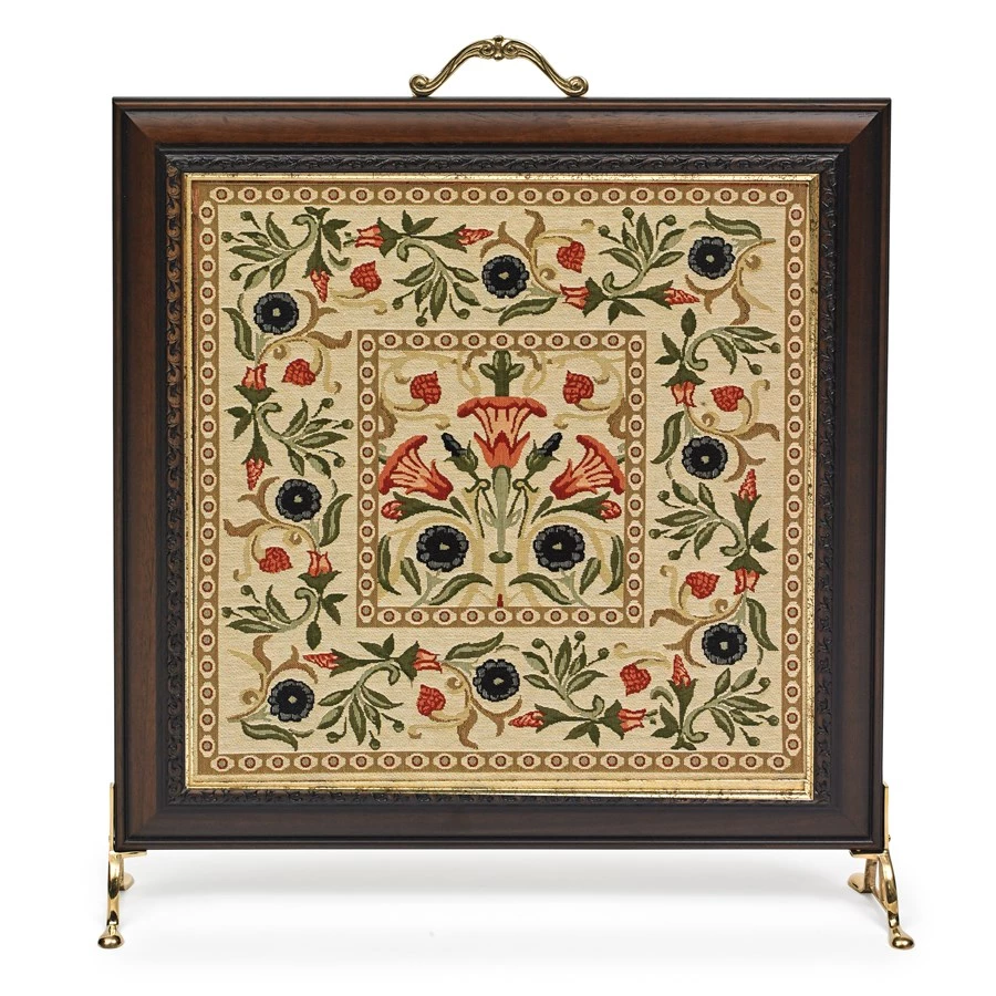 Decorate your fireplace when not in use. Handwoven cotton blend jacquard tapestry woven in Belgium and finished in England. Solid brass handles and feet. Exclusively at Scully & Scully.