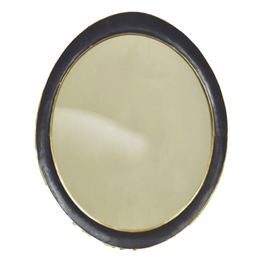 A seemingly simple hand-sculpted mirror. This elegant oval is delicate with a scooped panel that varies from top to bottom. Available in black with gold lacquer inner and outer edging and with Swarovski crystals.